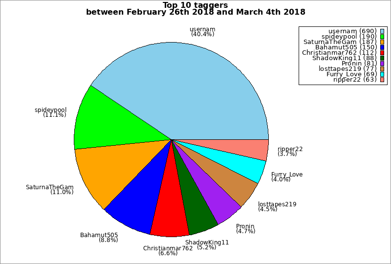 | Top 10 taggers between February 26th 2018 and March 4th 2018 | ||