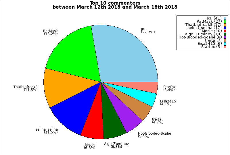 | Top 10 commenters between March 12th 2018 and March 18th 2018 | ||
