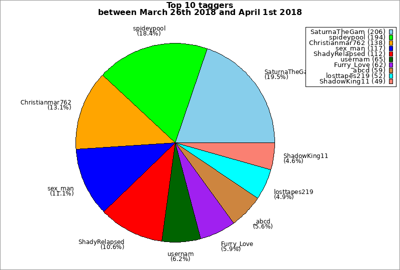 | Top 10 taggers between March 26th 2018 and April 1st 2018 | ||