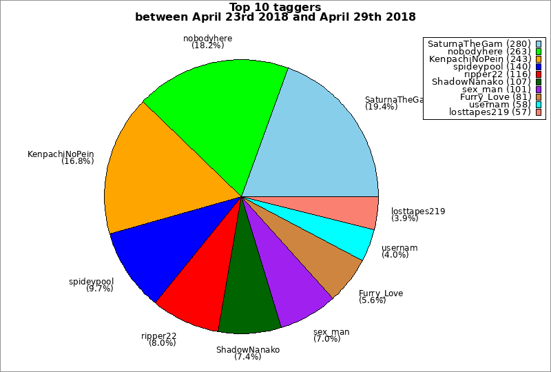 | Top 10 taggers between April 23rd 2018 and April 29th 2018 | ||