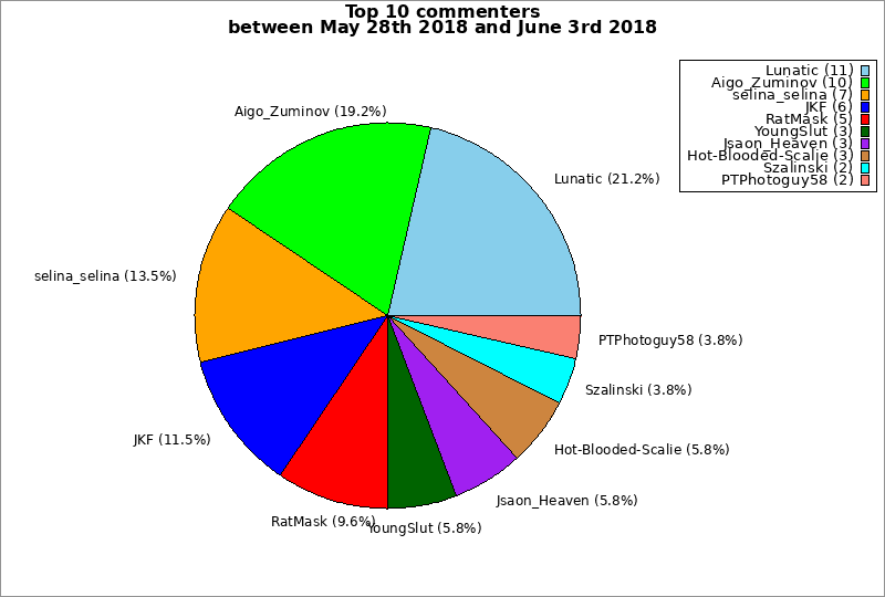 | Top 10 commenters between May 28th 2018 and June 3rd 2018 | ||