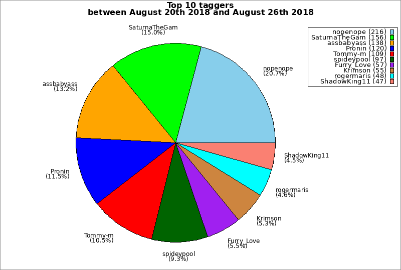 | Top 10 taggers between August 20th 2018 and August 26th 2018 | ||