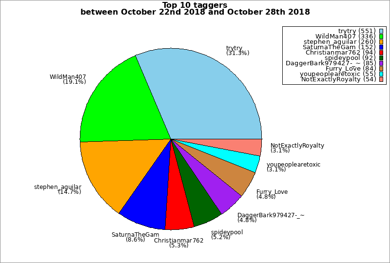 | Top 10 taggers between October 22nd 2018 and October 28th 2018 | ||