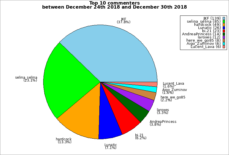 | Top 10 commenters between December 24th 2018 and December 30th 2018 | ||