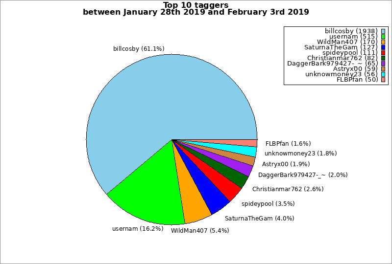 | Top 10 taggers between January 28th 2019 and February 3rd 2019 | ||
