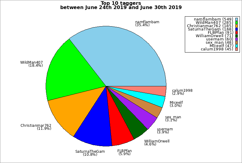| Top 10 taggers between June 24th 2019 and June 30th 2019 | ||