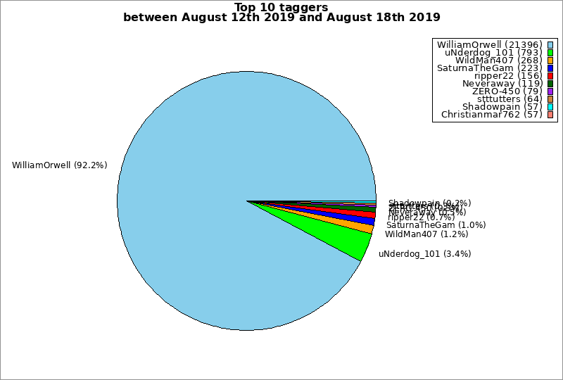 | Top 10 taggers between August 12th 2019 and August 18th 2019 | ||
