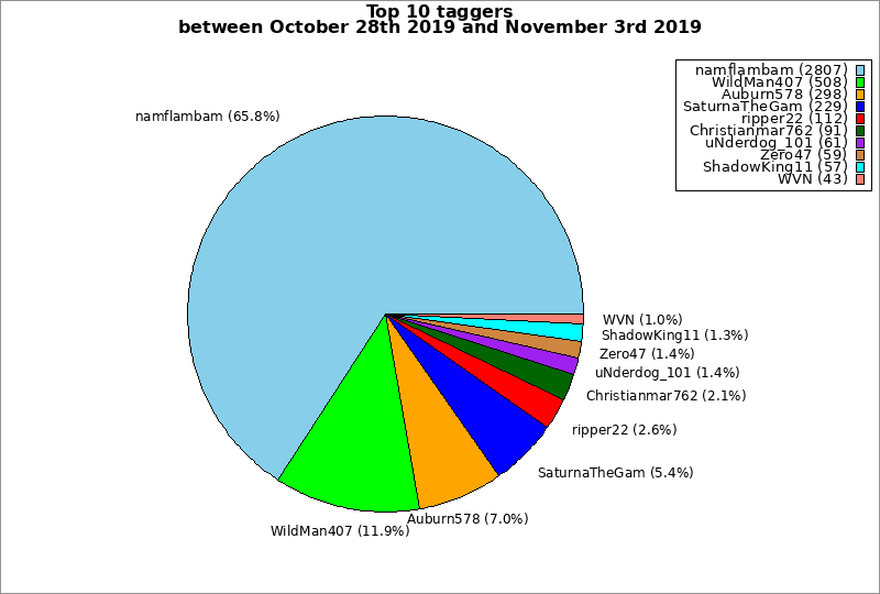 | Top 10 taggers between October 28th 2019 and November 3rd 2019 | ||