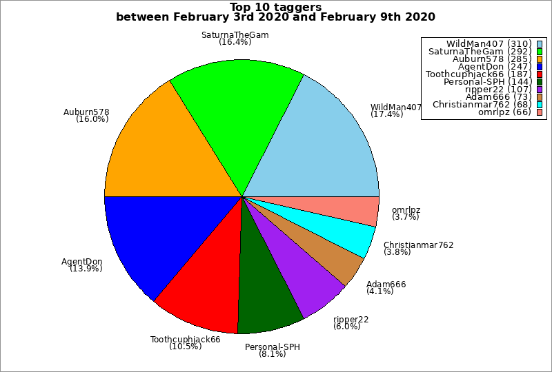 | Top 10 taggers between February 3rd 2020 and February 9th 2020 | ||