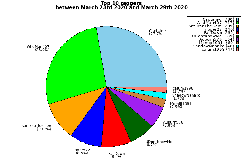 | Top 10 taggers between March 23rd 2020 and March 29th 2020 | ||