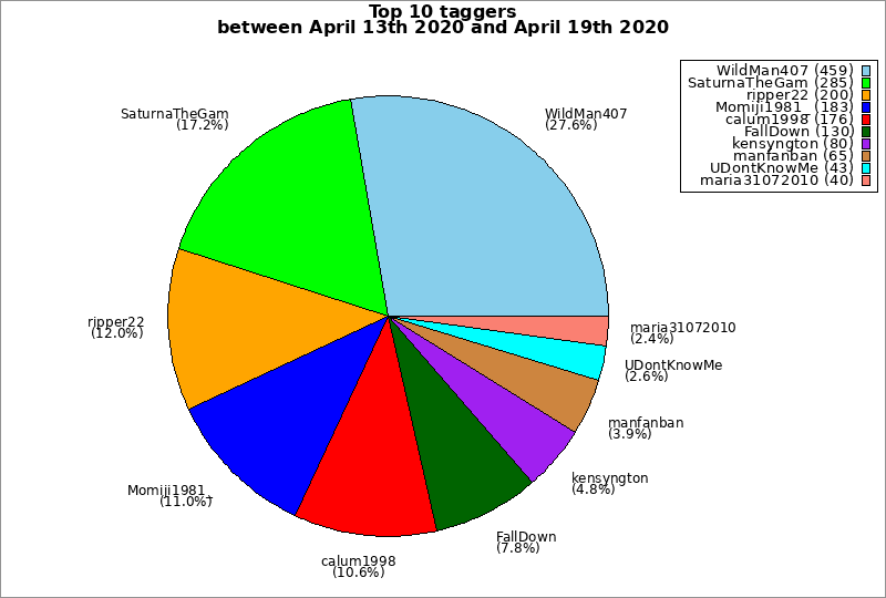| Top 10 taggers between April 13th 2020 and April 19th 2020 | ||