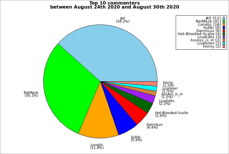 | Top 10 commenters between August 24th 2020 and August 30th 2020 | ||