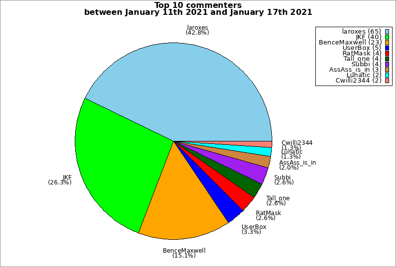 | Top 10 commenters between January 11th 2021 and January 17th 2021 | ||