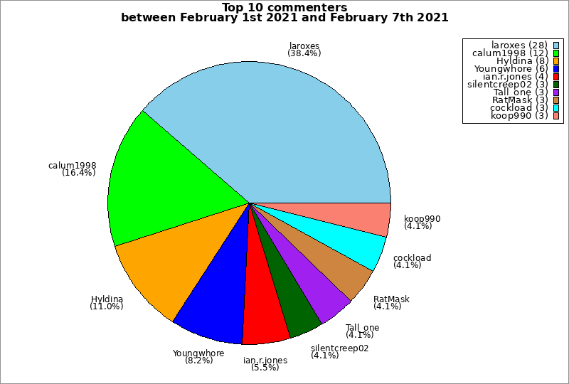 | Top 10 commenters between February 1st 2021 and February 7th 2021 | ||