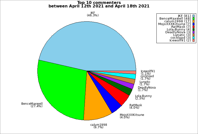 | Top 10 commenters between April 12th 2021 and April 18th 2021 | ||
