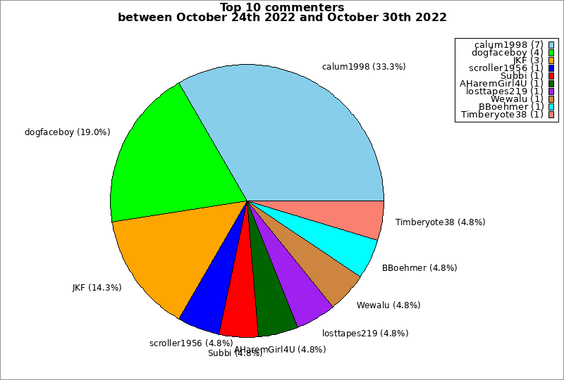 | Top 10 commenters between October 24th 2022 and October 30th 2022 | ||