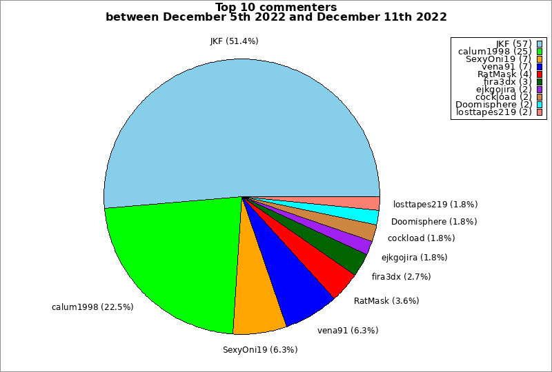 | Top 10 commenters between December 5th 2022 and December 11th 2022 | ||