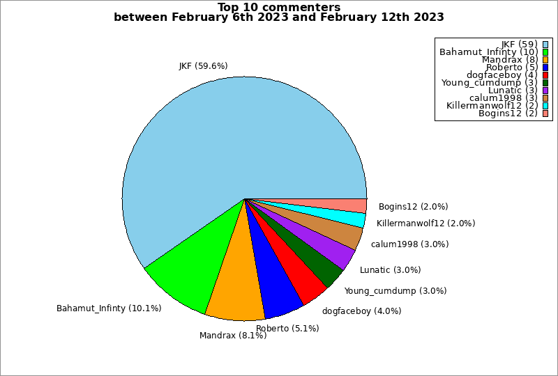 | Top 10 commenters between February 6th 2023 and February 12th 2023 | ||