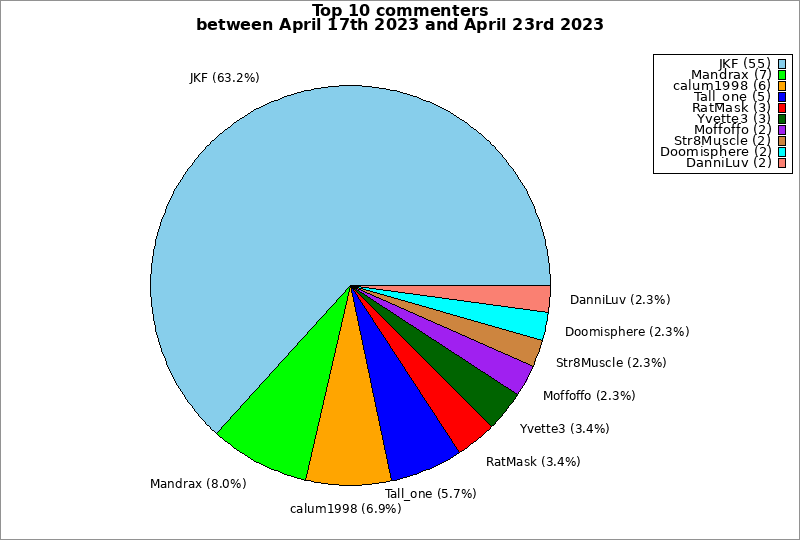 | Top 10 commenters between April 17th 2023 and April 23rd 2023 | ||