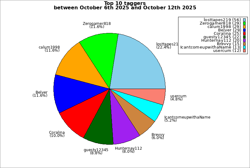 | Top 10 taggers between October 6th 2025 and October 12th 2025 | ||