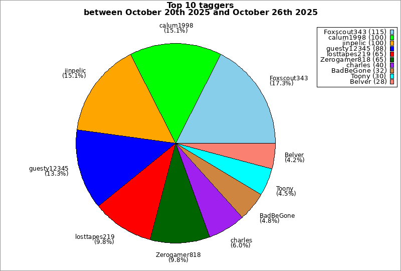 | Top 10 taggers between October 20th 2025 and October 26th 2025 | ||