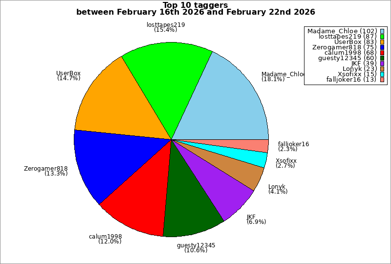 | Top 10 taggers between February 16th 2026 and February 22nd 2026 | ||